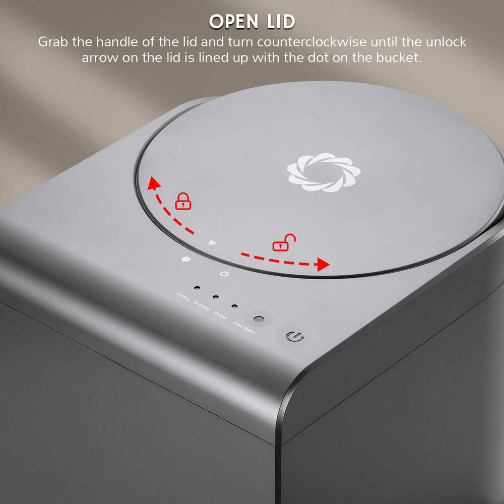 - Quick Run Time: Collect food waste in the bucket throughout the day then turn on the machine before going to bed. After 4 hours your food scraps will be ground up and dried into powder so you can empty it out in the morning.